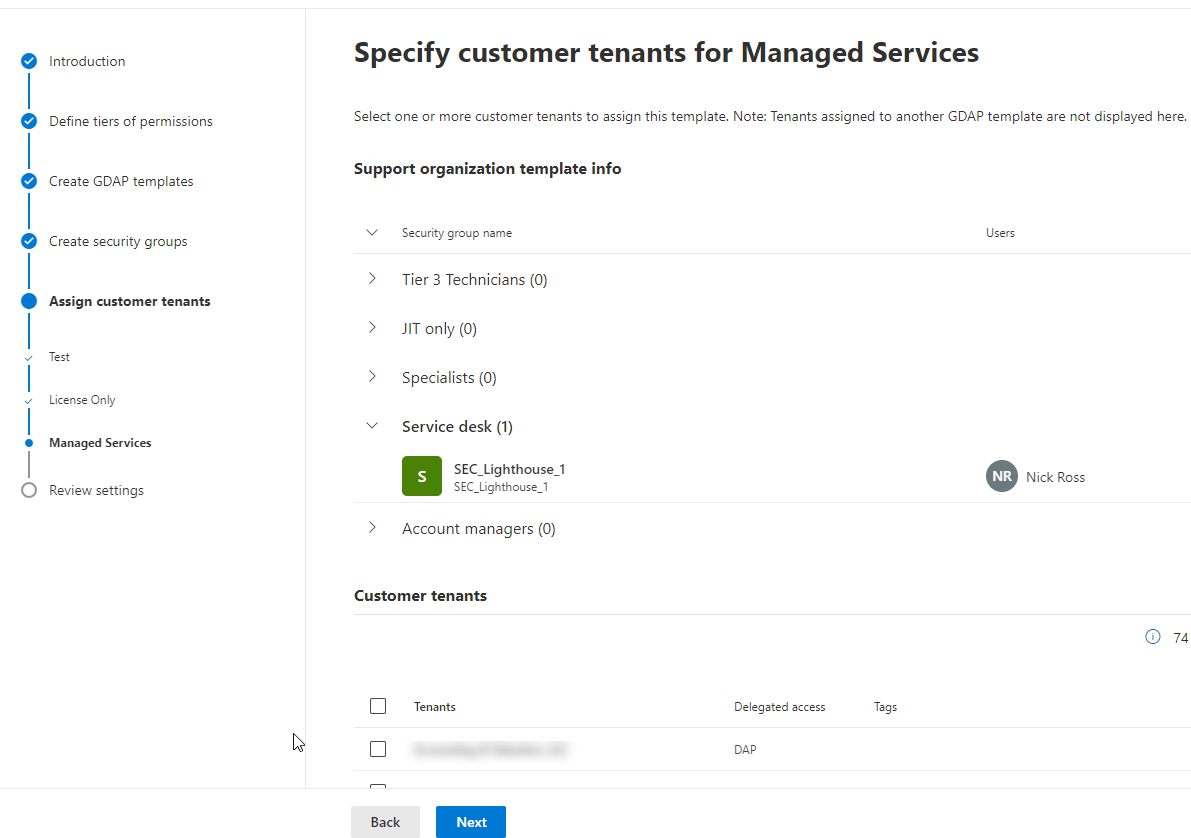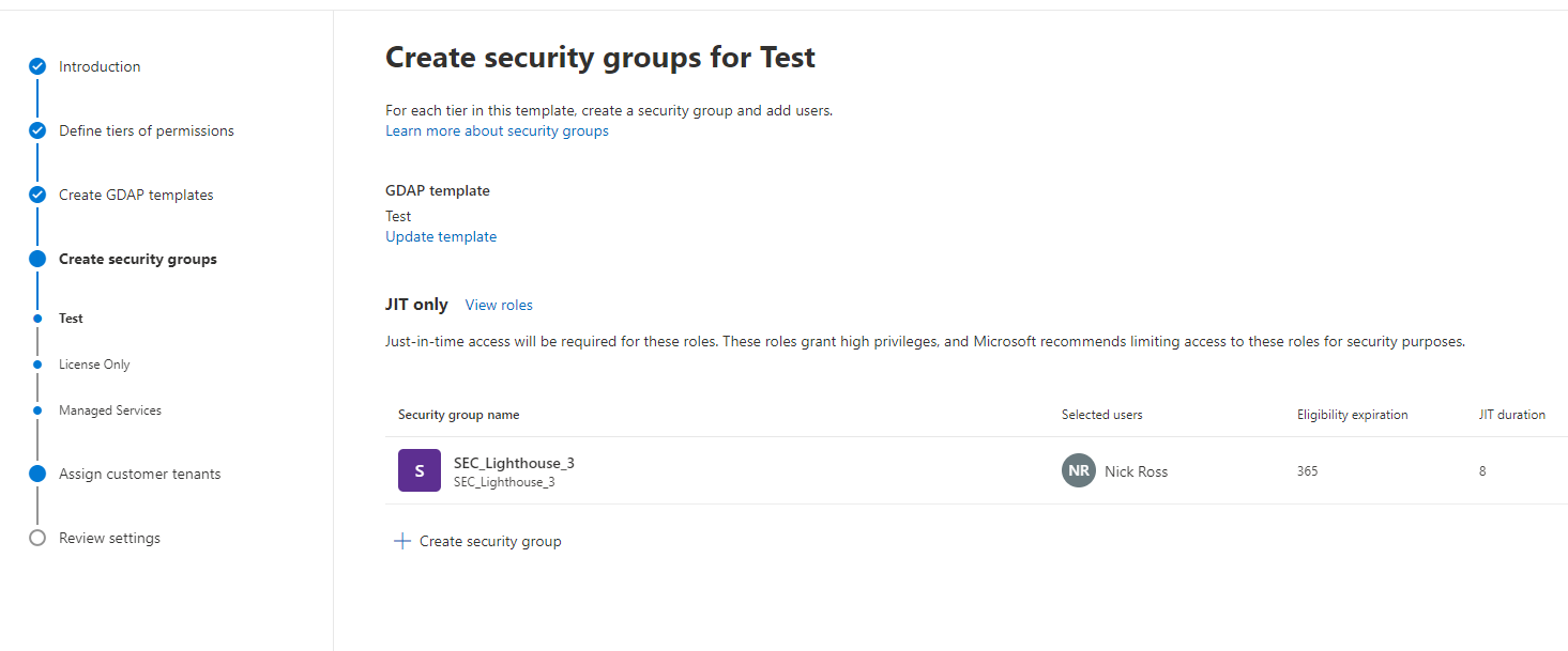 Security Group creation is next. You will be creating a new security group for at least each tier you want to use in your environment. The wizard steps you through each of your templates so you can associate the proper security groups. In the example I show below, we also see some additional settings for the JIT tier. Just-in-time access is much like PIM but it allows you to have even more security for higher privileged roles like Global Admins, Application Admins, etc. I believe that a JIT/PIM solution is very important to combine with GDAP. Behind the scenes, Lighthouse will create an Access Package in your Azure AD environment with the settings you define in this wizard