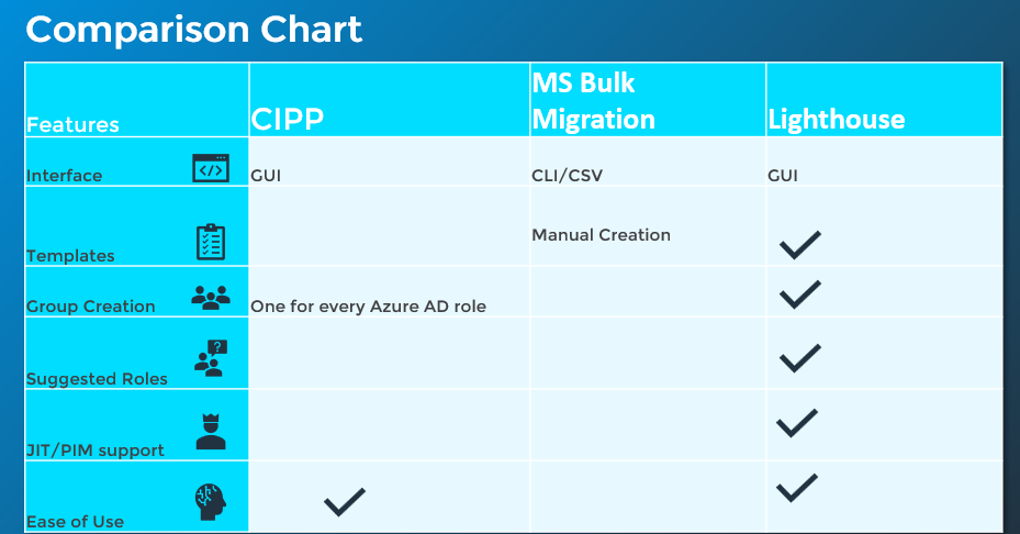 Group Creation is done in both CIPP and Lighthouse but in CIPP you are creating one group per Azure AD role. This can make things a little messy in your tenant from the amount of groups that you are creating. Lighthouse allows you to consolidate those groups and reuse them across templates/roles