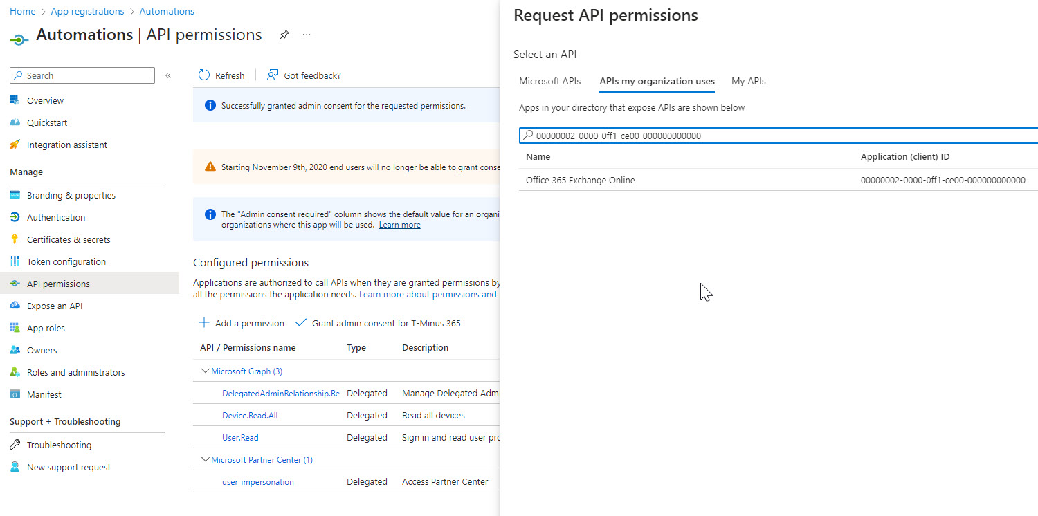Lastly, if you want to leverage automations for Exchange, you will want to add the Exchange Online APIs. Use this code for the search:00000002-0000-0ff1-ce00-000000000000