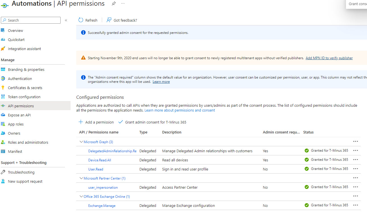 If you were to ever update permissions for the app registration, it would require that you have to re-consent across all of your customers. Right now, its not as simple as trying to re-run the above script. It does require that you remove the application and re-add it. There also does not seem to be a direct PS cmdelt to do this at this time either but it is available via the API: