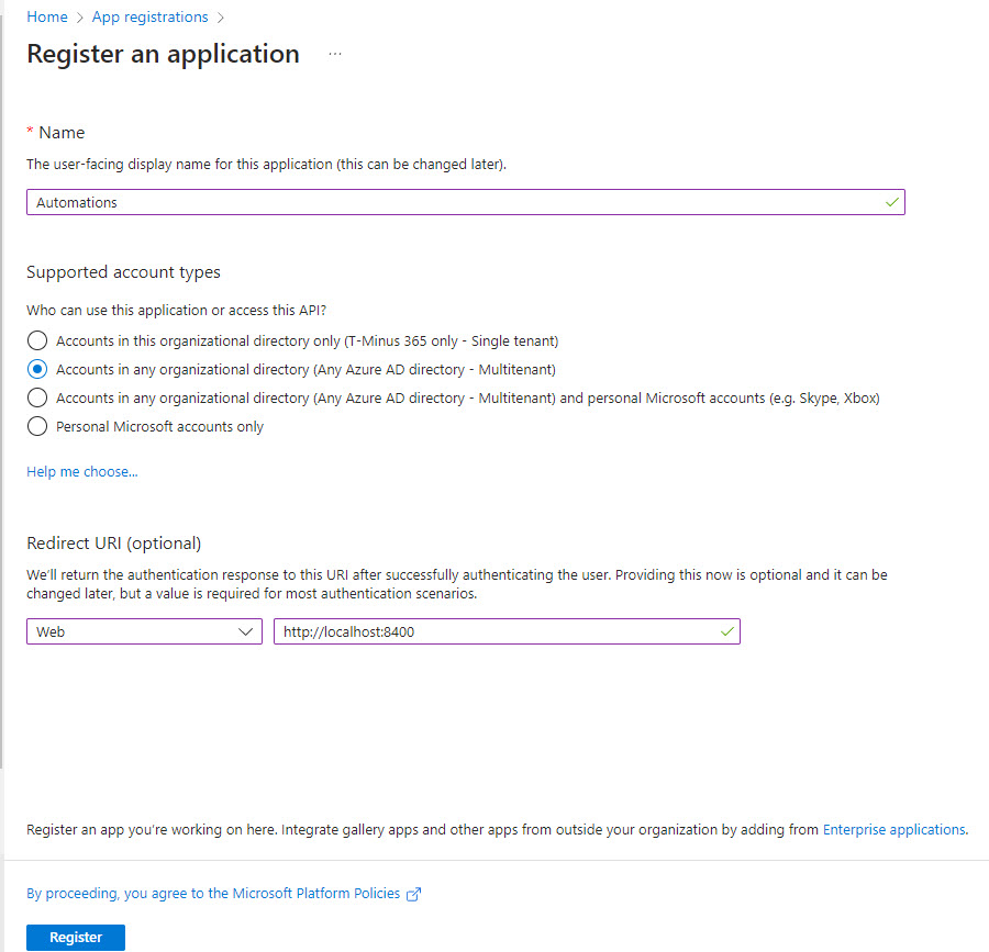 +New Registration. Add a Name, Multi-tenant app, and Redirect URI