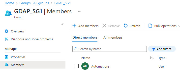 The other key step we need to take with our GDAP relationships, is to assign a Security group for the GDAP relationship that includes the service account we created in the first step as a member. In my use case, I created a group called GDAP_SG1 and added my service account as a member: