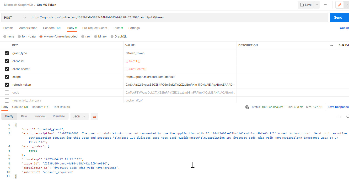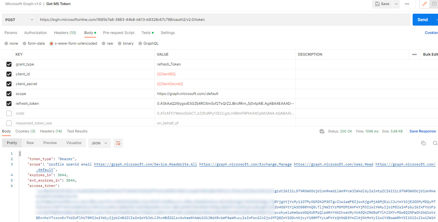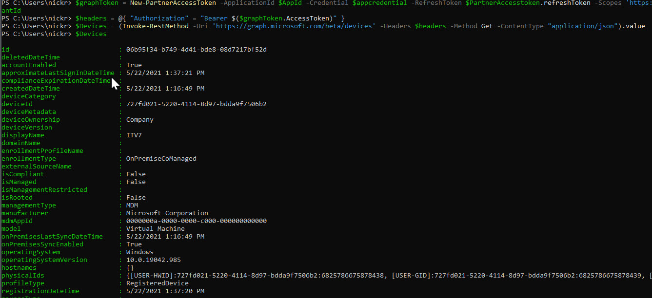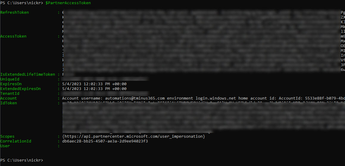When you run this script in PowerShell you will be promoted to sign in. This is where you will use your service account you created (and have the Global Admin role activated if using PIM). If successful, you should be able to call the $PartnerAccessToken variable to see your refresh token and access token