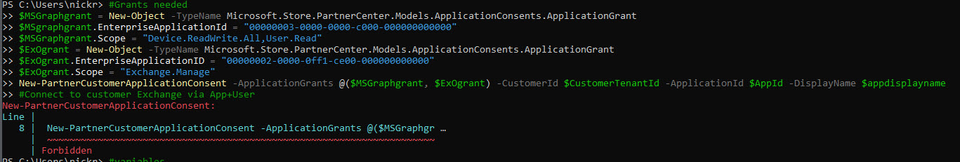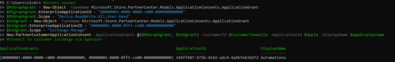 ^In this script, you will enter the tenant ID of a customer you want to test the consent process with. The other key piece you will want to change is the MSGraphgrant.Scope. Here is where you will put all of the permissions you added to your application registration, comma separated. I just have a few for the sake of this example.