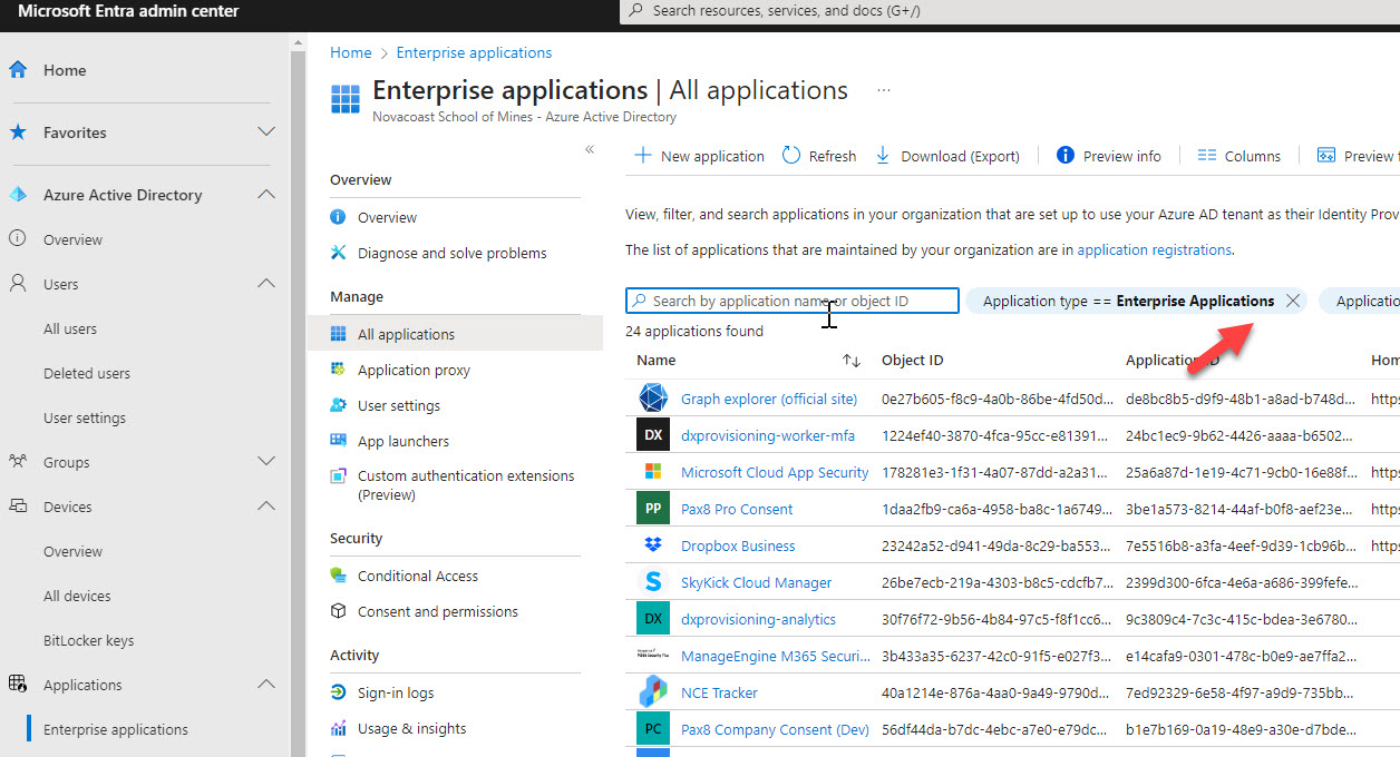 Login to the Entra admin center for the customer and go to Enterprise Applications. Click on the X for the filter by Application Type