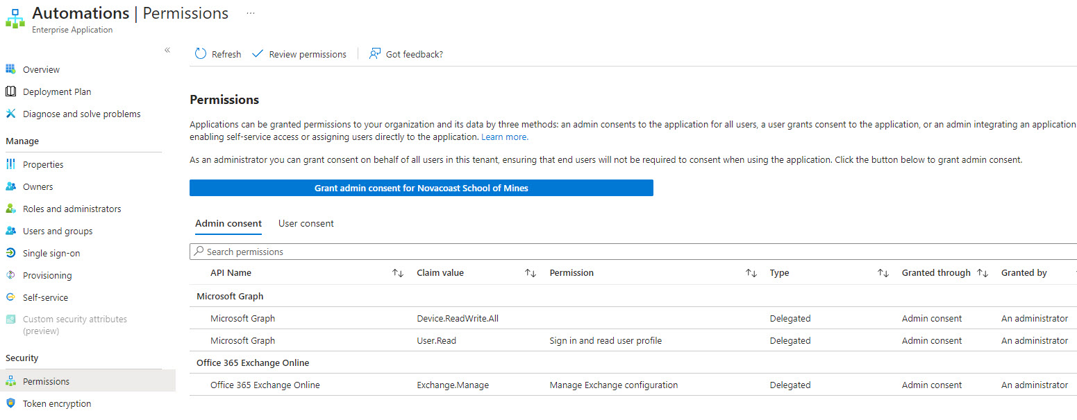 Note that you will need to be signed in as a Global Admin in order to perform this operation. The permissions shown below are just an example, you will likely have many more Microsoft Graph permissions.