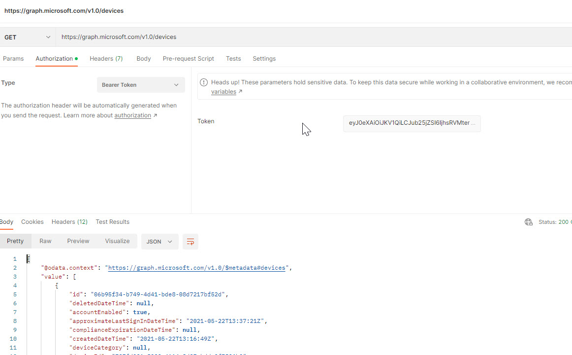 Successfully making an API call for a customer leveraging the permissions we defined for the app registration