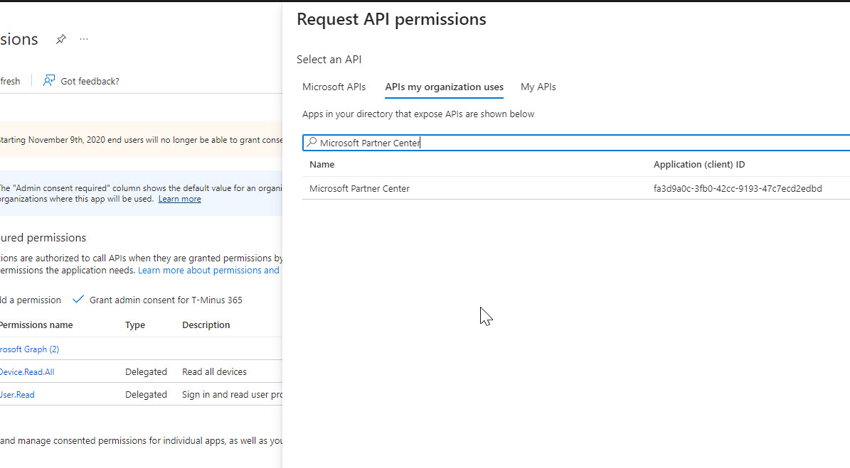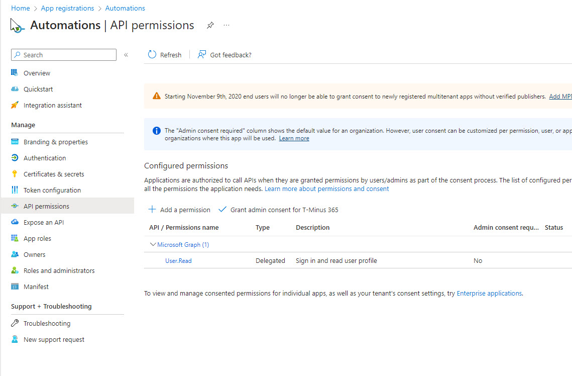When you are done adding your permissions here, you will want to click on the Grant Admin Consent for <Your Org>.