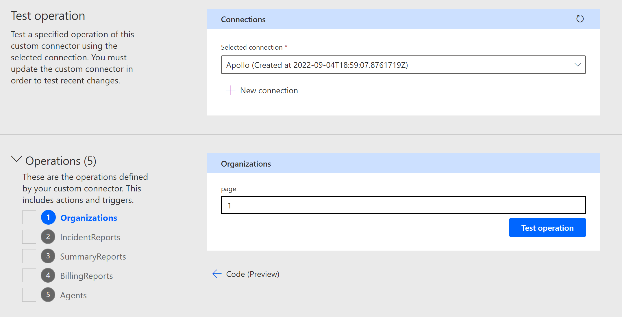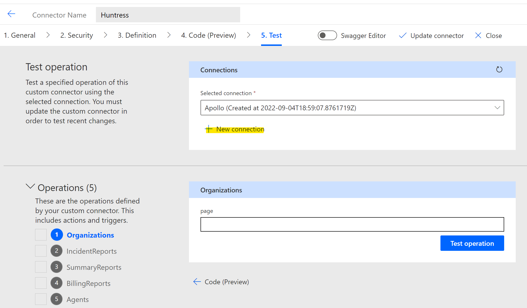 7. Finally, you can test the connection by selecting an operation and clicking Test Operation