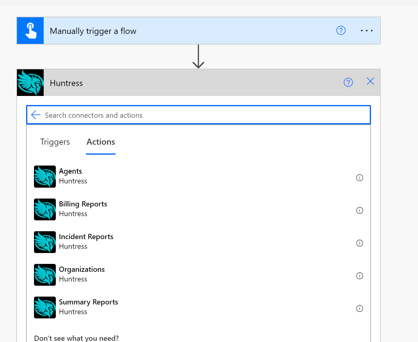 10. Now when you go to create a flow, you will have the Huntress connector as an option under Custom. All Endpoints you created under the Definitions section will be included