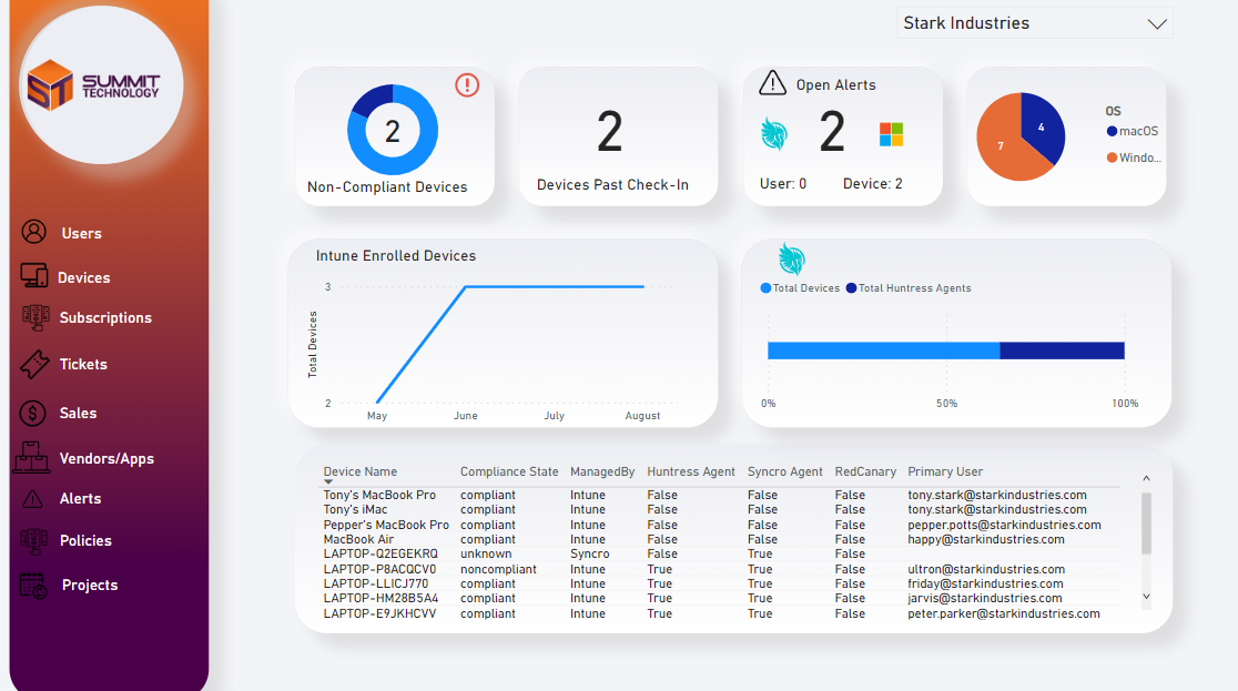 This is a Power BI report in which we can see device information across vendors. I wanted see if there were any disparities between what is reporting out of Intune, our RMM, and Huntress. Additionally, I wanted to pull in subscription information so I can aggregate it at a customer level.