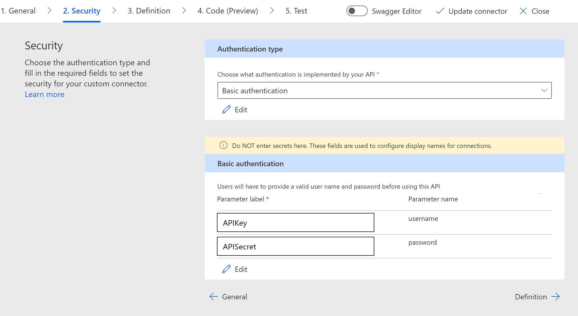 3. On the Security Page, select Basic Authentication. Add the labels of APIKey and APISecret. You will not add your information yet on this page, these are just labels: