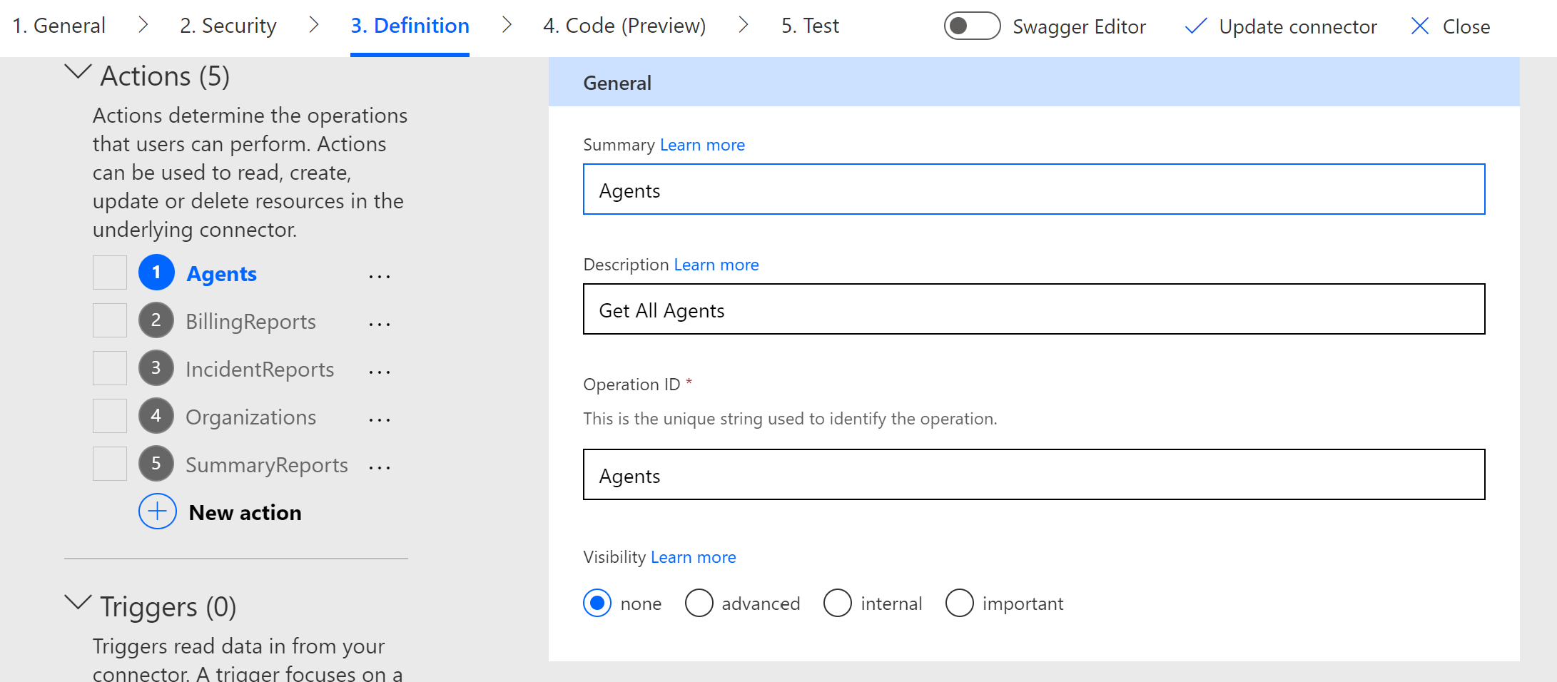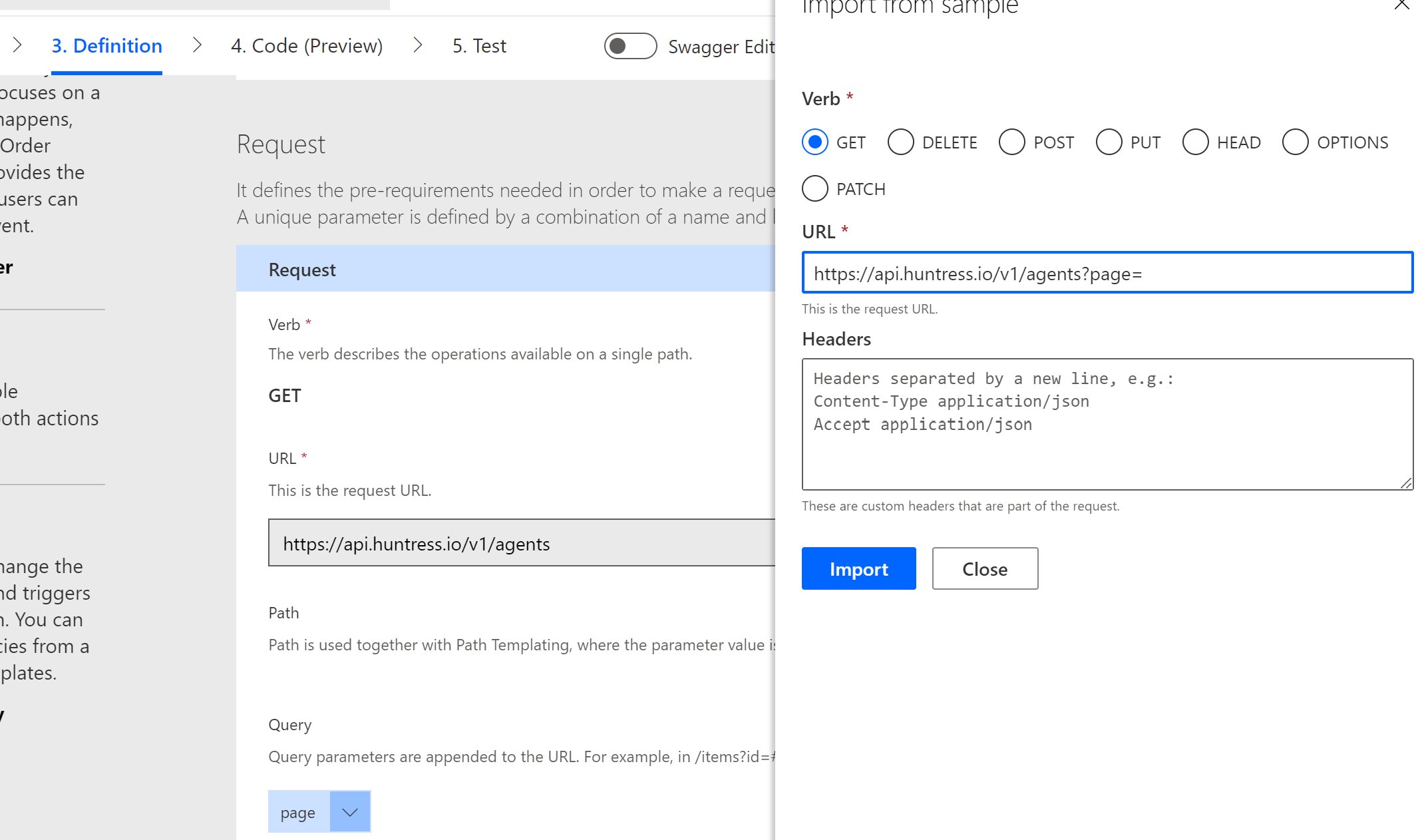 4. For the Definitions, you will add the Endpoints you want to leverage in your Power Automate flows.